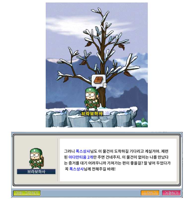 차디찬 벌판에 있는 브라보하사 에게 아다만티움 2개를 달라고 합니다.