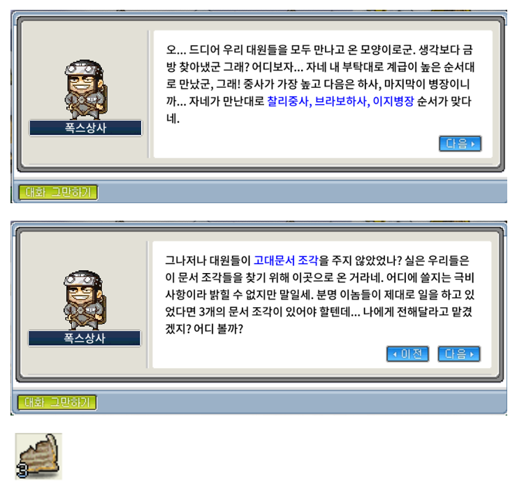 찰리중사, 브라보하사, 이지병장 순서대로 만나고 고대문서 조각 3개를 폭스상사에게 가져다주면 됩니다.